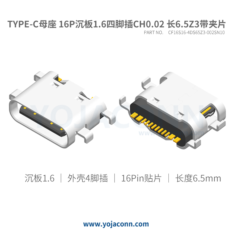 TYPE-C母座 16P沉板1.6四脚插CH0.02 长6.5Z3带夹片