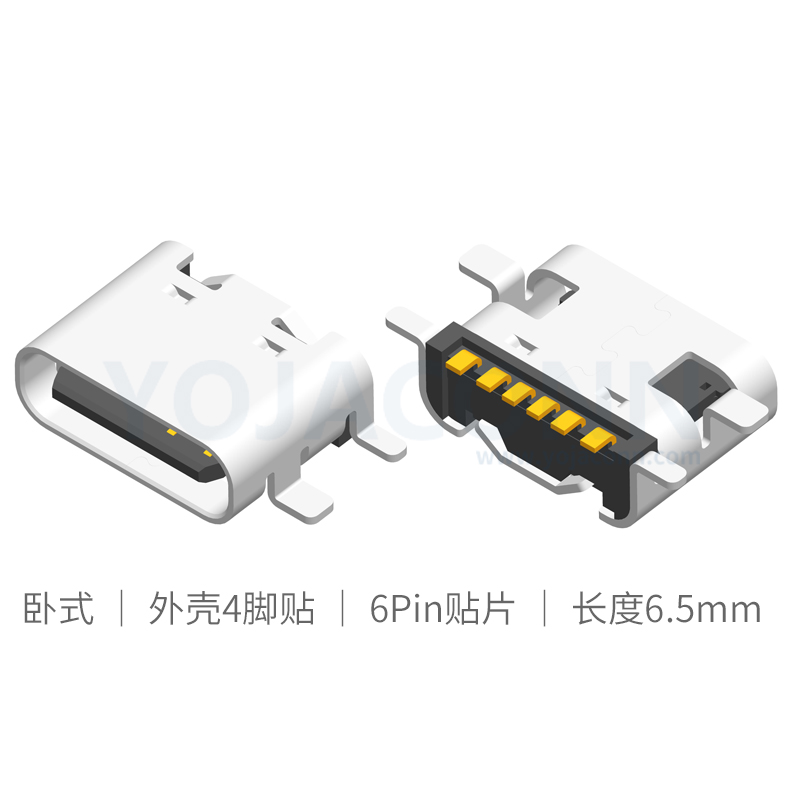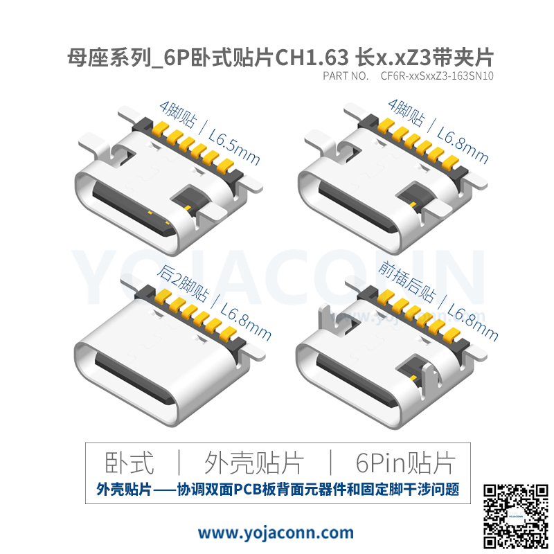 TYPE-C母座 6P卧式四脚贴CH1.63 长6.5Z3带夹片