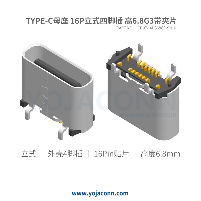 TYPE-C母座 16P立式四脚插 高6.8G3带夹片