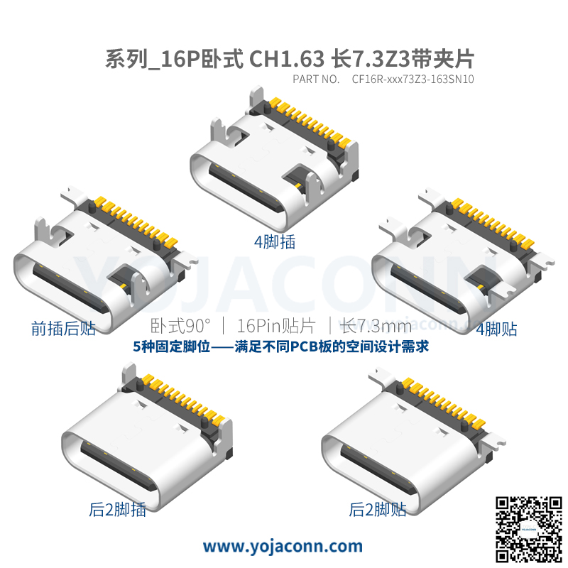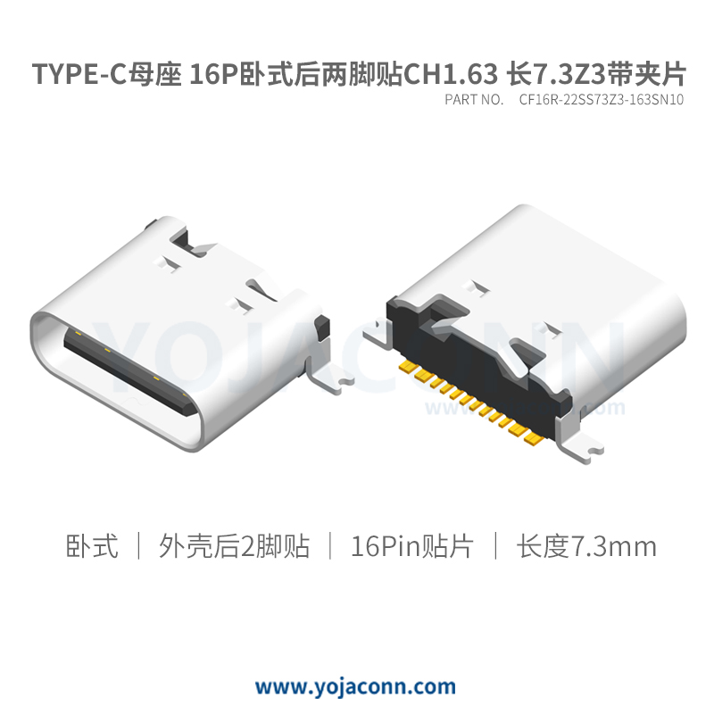 TYPE-C母座 16P卧式四脚贴CH1.63 长7.3Z3带夹片